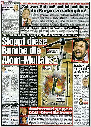 "Die israelische Regierung drohte indirekt mit der eigenen Militärmacht. Ein Sprecher von Israels Ministerpräsident Ariel Scharon: 'Gott sei Dank verfügt Israel über die Mittel, um das extremistische Regime im Iran scheitern zu lassen.'" Ist hier in Israel ein neuer Hitler erstanden, der ein anderes Land angreifen will? Das fragt 'Bild' nicht. Denn 'Bild' steht auf der 'richtigen' Seite.