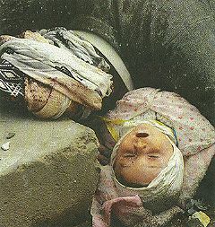 Auch nach dem Vorgang, der als Festnahme von Saddam Hussein bezeichnet wird, werden zum wiederholten Male Bilder von 1988 zu Hilfe gezogen, um klar zu machen, wo das Böse zu suchen ist, und das obwohl bis heute nicht erwiesen ist, welche Seite im Iran-Irak-Krieg damals für den Giftgaseinsatz von Halabja verantwortlich war; und obwohl diejenigen, die den Giftgaseinsatz heute zu Propagandazwecken verwenden, ihn damals kaum der Erwähnung wert fanden, sondern im Gegenteil den Irak als Kriegspartei unterstützt haben. "Denn die Schmier- und Zündmittel für Saddams Todesmaschine kamen auch aus Washington, Paris, Bonn, Moskau, London, Madrid und anderen Orten... Und wie belanglos die Kohl-Regierung das Giftgasmassaker vom März 1988 gegen die Kurden in Halabja fand, als sie Saddams Regime ein Vierteljahr später einen Hermes-Kredit ausreichte..." ('Neues Deutschland' vom 16.12.2003) Die kurdische Stadt Halabja sei 1988 durch Saddams Truppen ausgelöscht worden, schreibt die Bild-Zeitung. Die Stadt hatte 40.000, nach anderen Angaben 80.000 Einwohner. Die sind gemäß Bild-Zeitung also alle umgekommen. Der 'Stern' schreibt von 5000 Kurden, die infolge des Gasangriffs in Halabja gestorben sein. Auch an anderer Stelle lesen wir von 5000 Getöteten. Die Bild-Zeitung übertreibt. So genau werden es ihre Leserinnen und Leser nicht in Erinnerung haben, werden sich die Schreiber gedacht haben. Die Bilder aus 'Bild' und 'Zeit' zeigen die gleiche Szene. Die Bild-Zeitung sieht ein Kind mit seiner Mutter, die 'Zeit' ein Kind mit seinem Vater. Stimmen kann nur das eine oder das andere. Mindestens eine der beiden Angaben ist falsch. Aber falsche Behauptungen spielen keine Rolle. Es geht nicht um Wahrheit. Es geht um Feindbilder. Ein und dasselbe Ereignis ist heute belanglos und morgen von unschätzbarem Wert - je nach Interessenlage. Ein und dasselbe Opfer bedarf heute keiner Beachtung und morgen verursacht es den Aufschrei in fast der gesamten Medienlandschaft - je nach geostrategischer Interessenlage. Die Medien - sei es die Bildzeitung oder die 'Zeit', sei es der Spiegel' oder der 'stern' - bedürfen keiner Steuerung, sie steuern sich selbst. Sie sind entweder auf dem einen oder auf dem anderen Auge blind. Sie wissen, wann es welche Verbrechen zu legitimieren oder anzuprangern gilt und wann welche Opfer von Bedeutung sind und wann welche nicht. Sie sind Teil eines genialen Systems. |